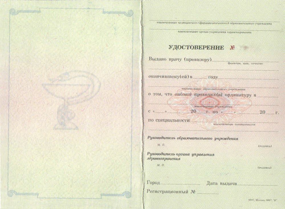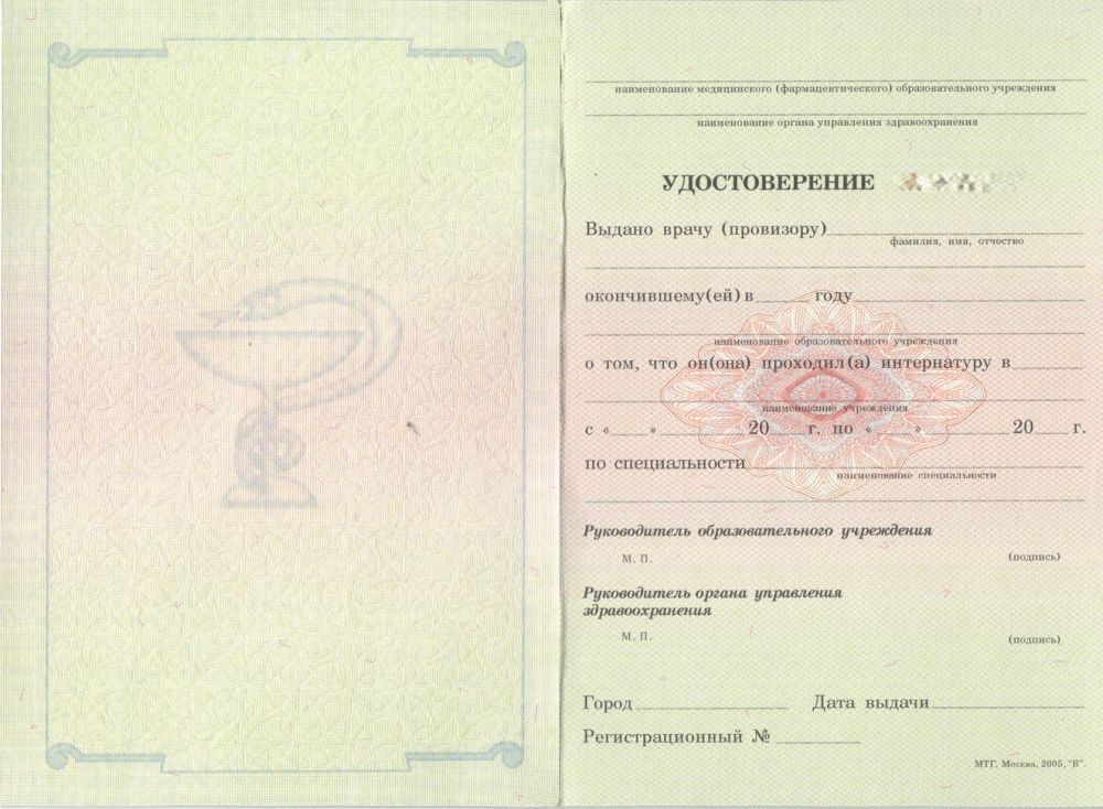 Если вы решите купить удостоверение интернатуры или ординатуры образца 2005-2012 года, обратите внимание на его оформление и убедитесь в том, что оно выполнено на подлинном бланке. Бланк документа заключен в твердую обложку зеленого цвета, на лицевой стороне которой содержится название документа (надпись «Удостоверение»). Разворот удостоверения выполнен в розово-зеленом цвете и состоит из левой и правой частей. На левой части изображена чаша со змеей, в правой указано название документа, а также индивидуальный номер бланка.